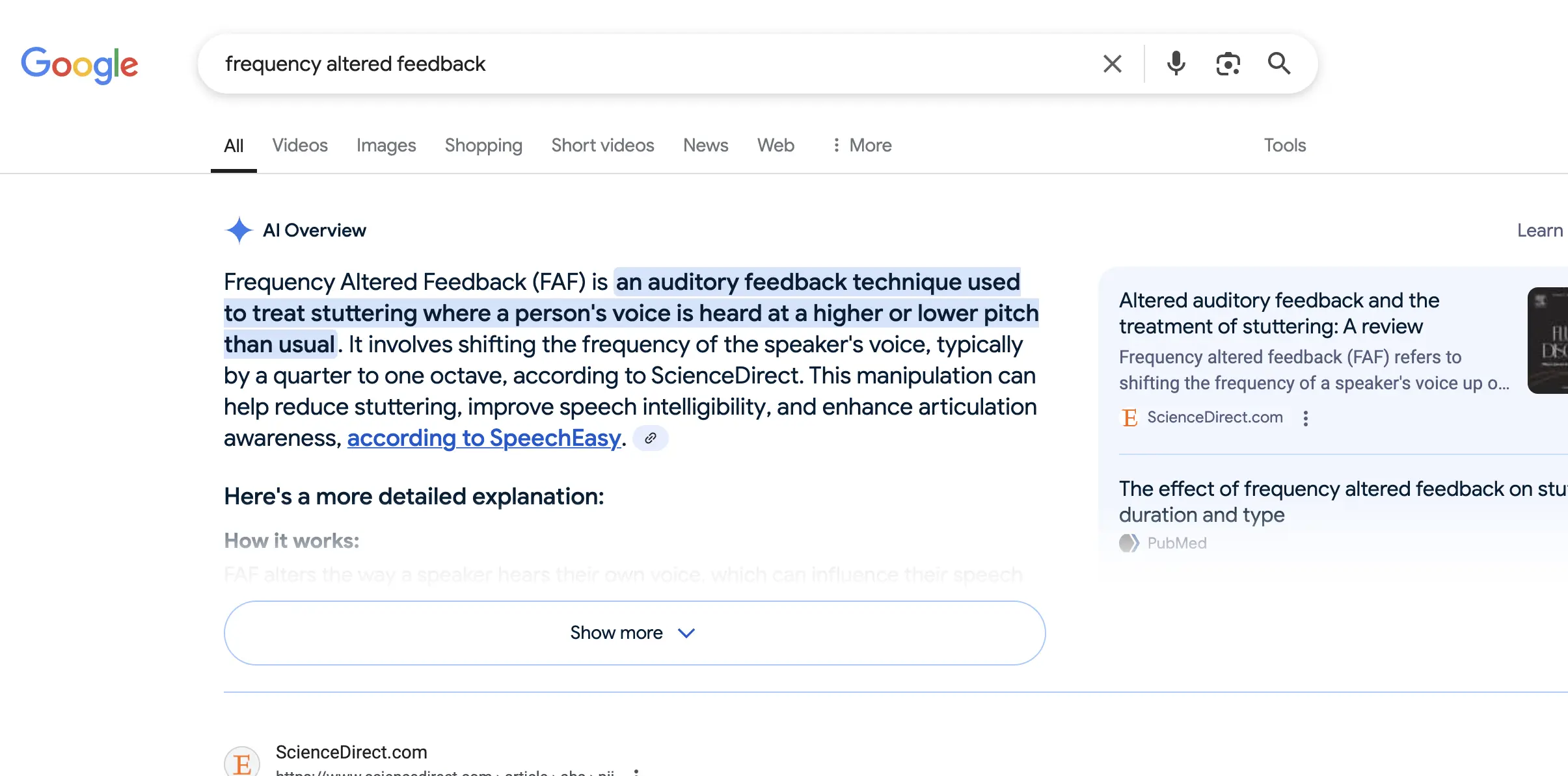 SpeechEasy, a leader in stuttering devices, now appears in Google’s AI Overview for key search queries that matter most to their audience. By creating clear, informative, and well-structured content that speaks directly to the needs of potential customers, we positioned their website as a reliable source both Google and real people can trust.