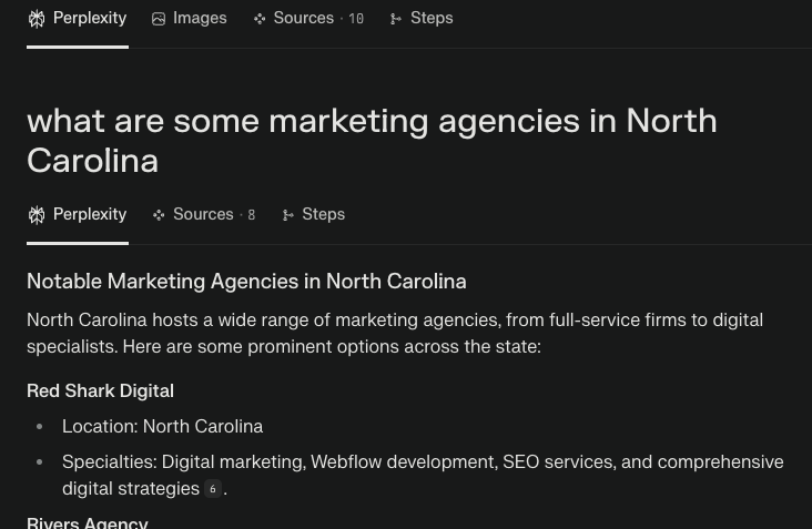That’s exactly why Red Shark Digital appears in Perplexity’s answers to questions like, “What are some marketing agencies in North Carolina?” We didn’t just optimize a page or chase a trend: We’ve earned that spot from invested time building a deep, strategic content library on our own site, testing it in the real world, and using it to establish authority across both traditional search engines and AI-generated platforms, consistently ranking ahead of our competitors.