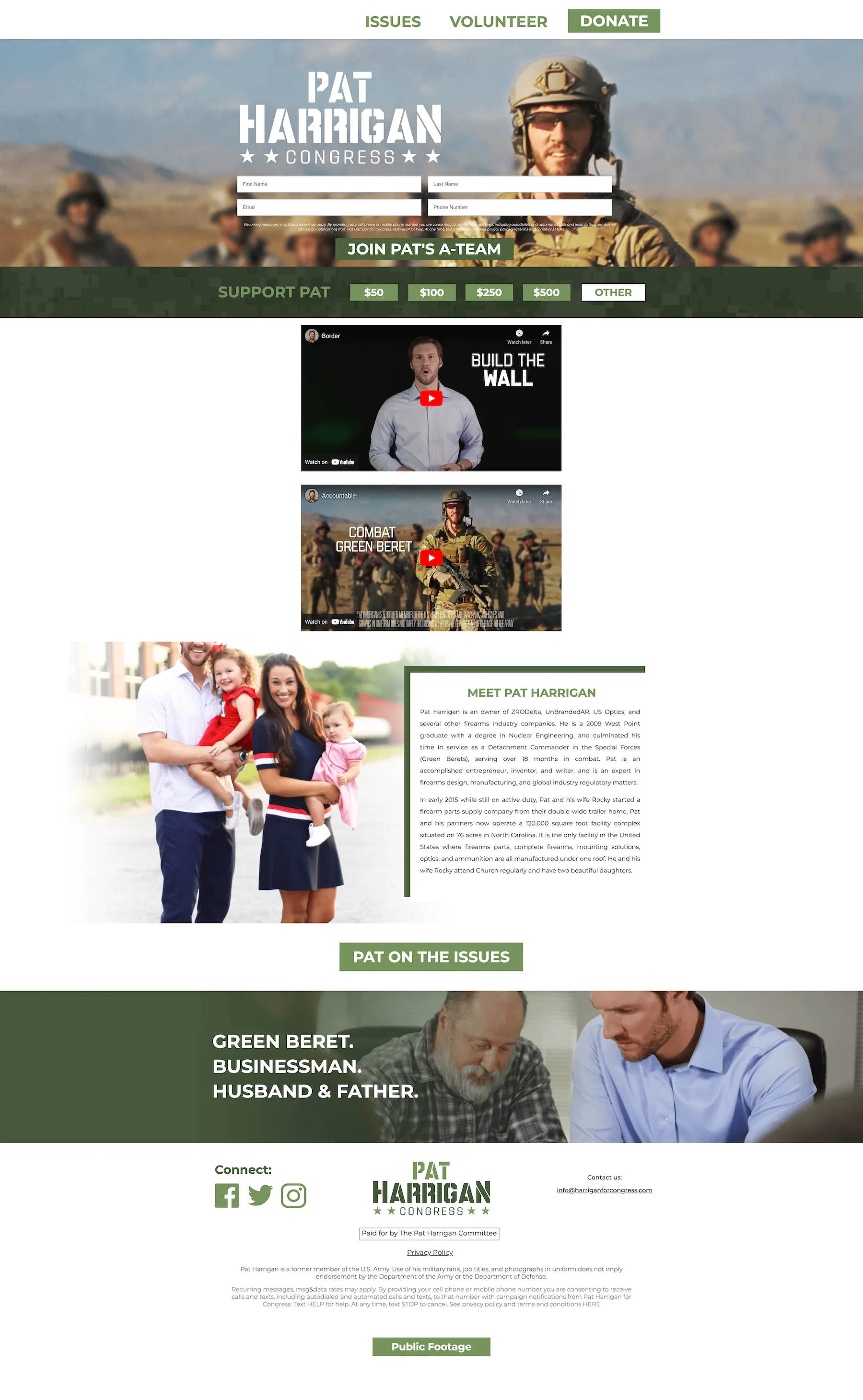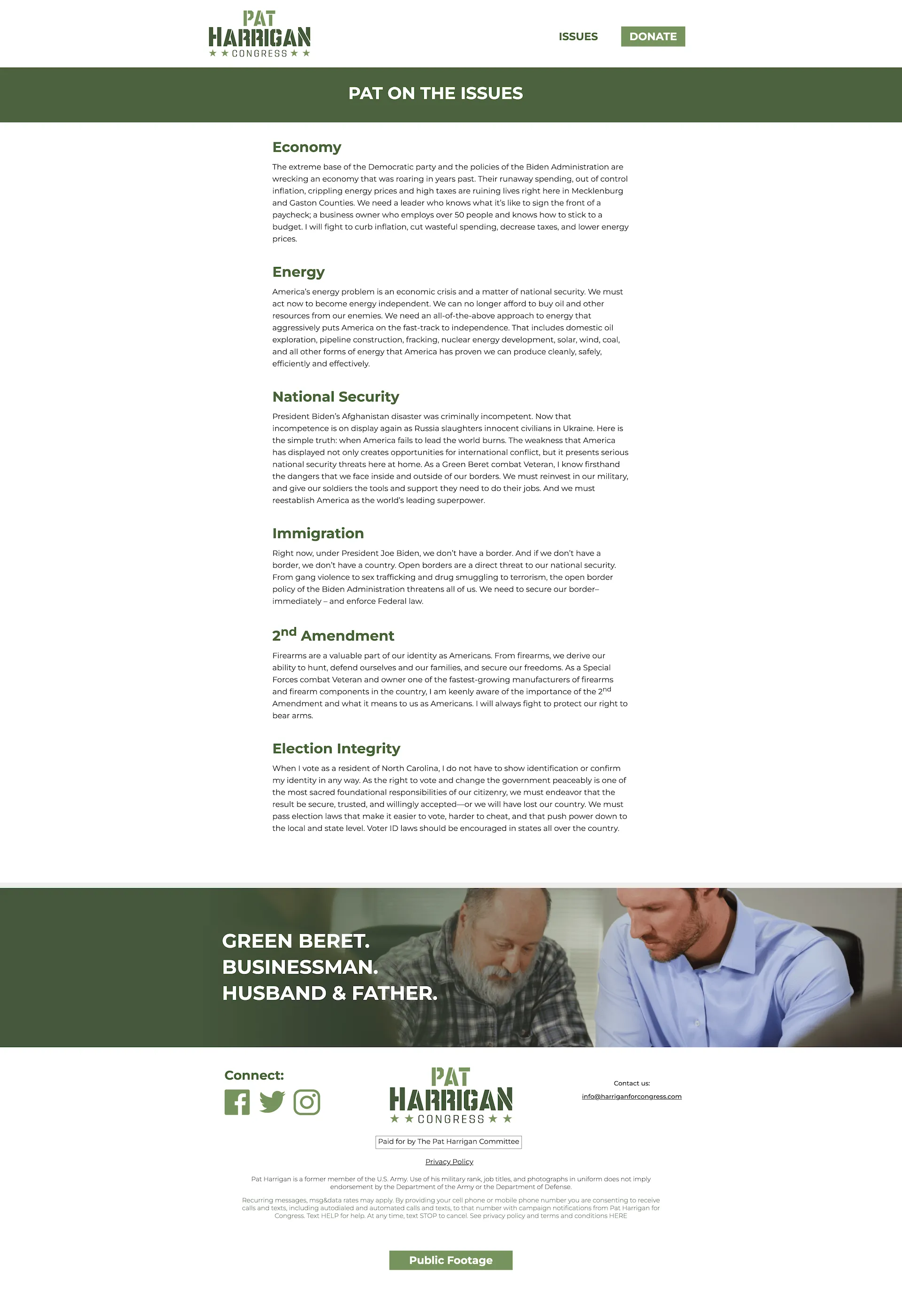 Red Shark Digital has officially launched a political Webflow website for U.S. Congressional candidate, Pat Harrigan. Pat is a Green Beret, businessman, dedicated husband, and father who came to North Carolina to serve, and stayed in North Carolina to grow his businesses and raise his family. After serving in Afghanistan, Pat felt the call to serve.