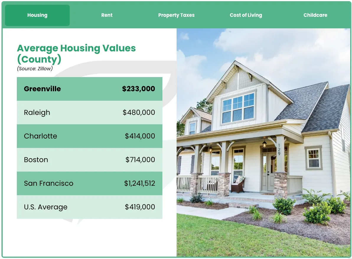 Explore data comparing housing costs, rent prices, property taxes, cost of living, and childcare expenses with cities like Raleigh, Charlotte, Boston, and San Francisco—as well as the overall U.S. average. Spoiler alert: Greenville offers incredible affordability without sacrificing quality of life.