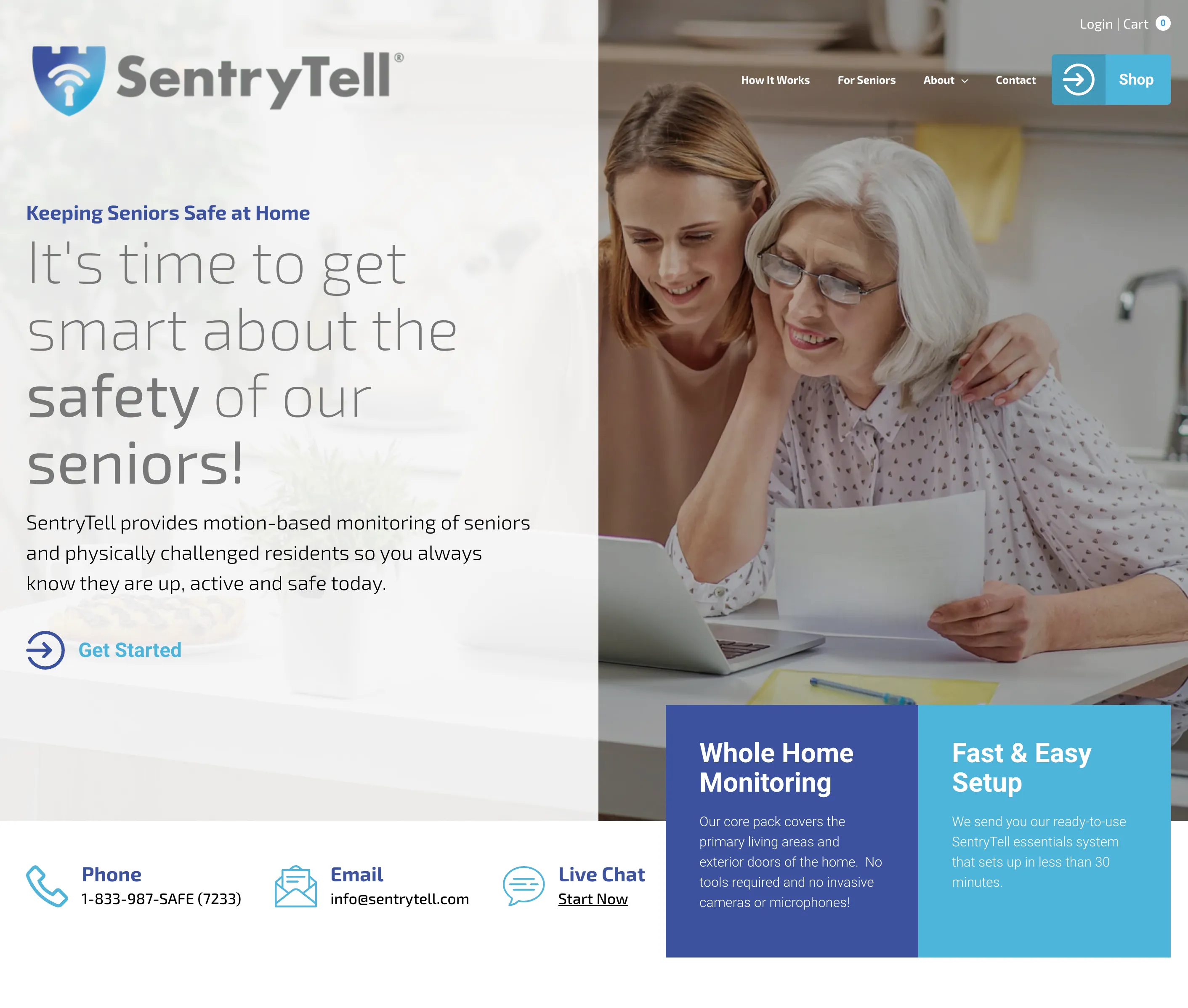 The SentryTell website offers a clean, user-friendly, technology e-commerce structure and flow, layering in the SentryTell color pallet anchored to healthcare’s most common colors, light and dark blue, light gray, and white.