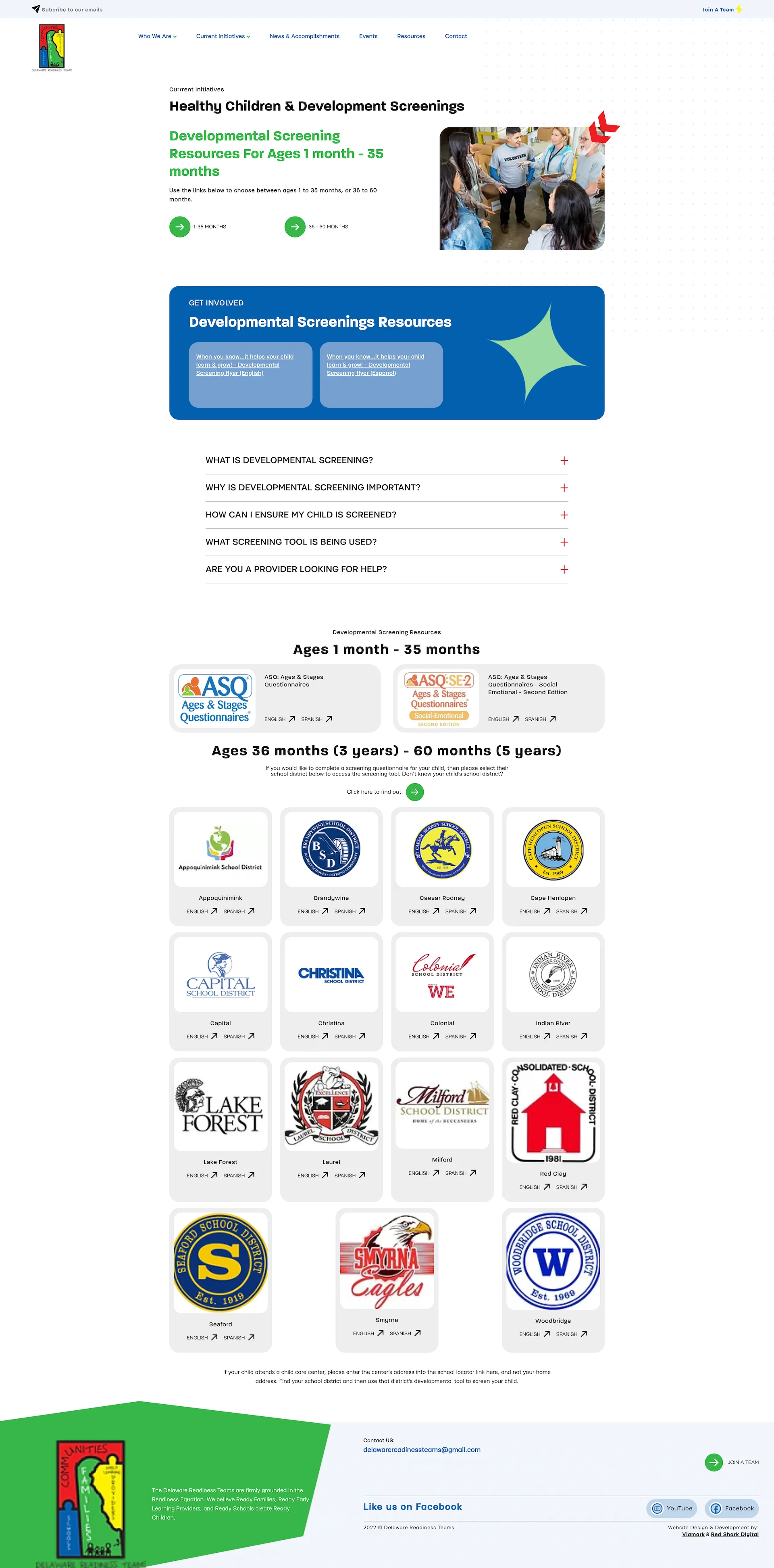 The Healthy Children & Development Screenings page displays Developmental Screening Resources, an FAQ section, and screening questionnaires for a multitude of school districts in both English and Spanish.